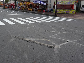 また、緩やかなカーブや微妙に進行方向を修正する場合は、先導指示役の笛の合図をうけ、「せーの」の掛け声で「とんぼ」を押して山車の進行角度を調整します。車輪を滑りやすくするために、竹のへらを地面の舗装と車輪の間にタイミングよく差し込む工夫をする町もあります。(新一・新二・東一)